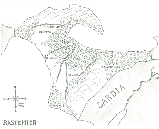 - The Stained Rocks - Several sites throughout Rastemier host such sites, but the most well known is atop a lonely hill southeast of Skane. Several stone steps lead up to a roughly flat area, upon which a large stone altar sits. Crude, heavy, rusted manacles and shackles are embedded into the four corners of the flat stone altar, large enough to hold most humanoids. The stone itself, and the ground around, are stained a crimson so dark it's almost black. The stained rock is an ancient tradition in Rastemier; though its original purpose is largely lost to time. In Skane, rather than face a public execution, criminals are brought to the stone on nights of the full moon and left chained as an offering to the wild. This has the effect of keeping the wild at bay and simultaneously deterring serious crimes.