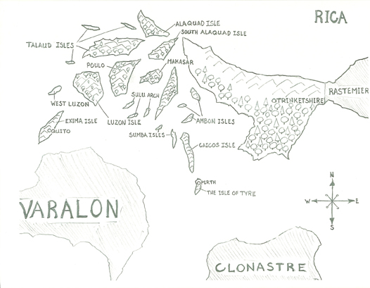 Most of the western islands of Rica, as well as Tyre and its neighbor Caicos in the east, are populated and civilized. Individual islands are largely self-ruled, while regional matters are handled by a loose alliance of five independent city-states known as the Cirtheen Accord. Exima, Tyre, and Trinketshire form the voting powers of this alliance. Poulo and Talaud, though members, hold no sway within the group as a result of past wars and treaties.